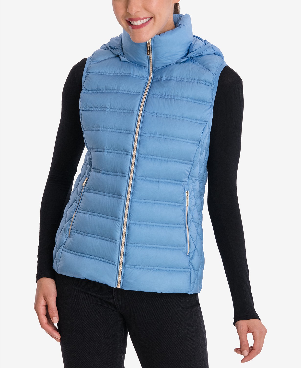 Stylová péřová dámská vesta Michael Kors s kapucní. Vestu lze složit do pytlíčka.